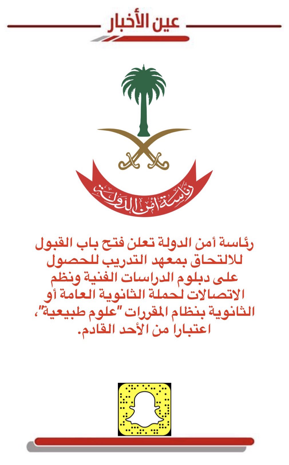 مهند وظائف القصيم Sur Twitter تعلن رئاسة أمن الدولة عن فتح باب القبول والتسجيل لحملة شهادة الثانوية العامة أو الثانوية بنظام المقررات علوم طبيعية للالتحـاق بالدراسة في معهـد التدريب يوم الأحد