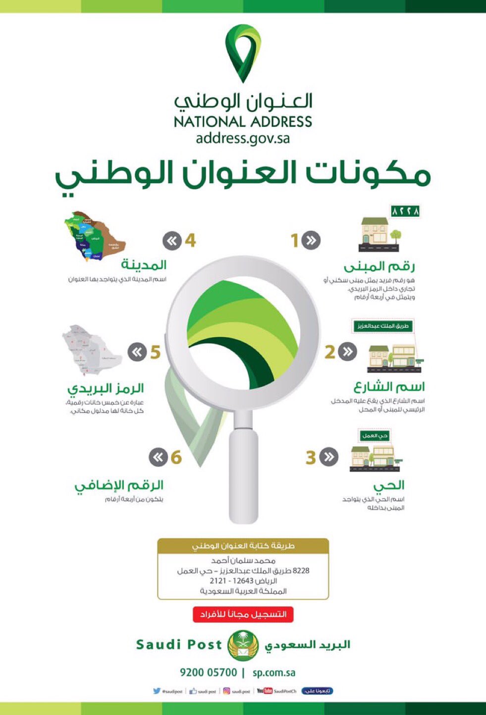 البريد السعودي On Twitter يتكون العنوان الوطني من 6 عناصر رقم المبنى اسم الشارع اسم الحي الرمز البريدي الرمز الإضافي المدينة